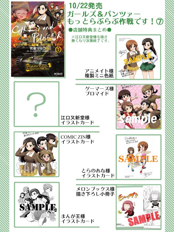 ট ইট র 弐尉マルコ らぶらぶ作戦 最新第14巻7月20日発売 10月22日発売 ガールズ パンツァーもっとらぶらぶ作戦です 第7巻 描き下ろし店舗特典まとめました 江口又新堂様をのぞき無くなり次第終了です よろしくお願いします
